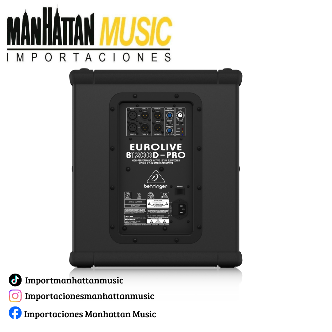 El Behringer EUROLIVE B1200D-PRO es un subwoofer activo diseñado para reforzar frecuencias graves en sistemas de PA para eventos pequeños y medianos. Gracias a su amplificador Clase D de alta eficiencia y su transductor de 12”, ofrece una respuesta potente y definida en graves, ideal para complementar parlantes full-range en aplicaciones en vivo, DJs, bandas y eventos corporativos, manteniendo un formato compacto y fácil de transportar.